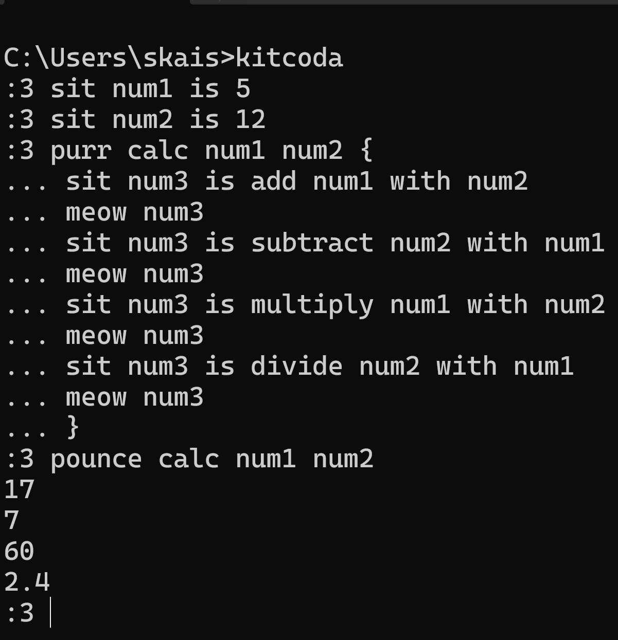 kitcoda is a kitten-based esoteric programming language (esolang). each command is something a cat can do, such as eat, sit, or meow. it has very similar syntax to python, which it is programmed in.